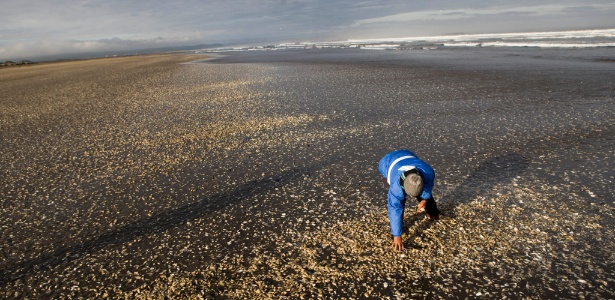 Pescador inspeciona mariscos cobrindo a praia de Cucao, na ilha de Chiloé, no Chile, que foi declarada zona de emergência devido à maré vermelha