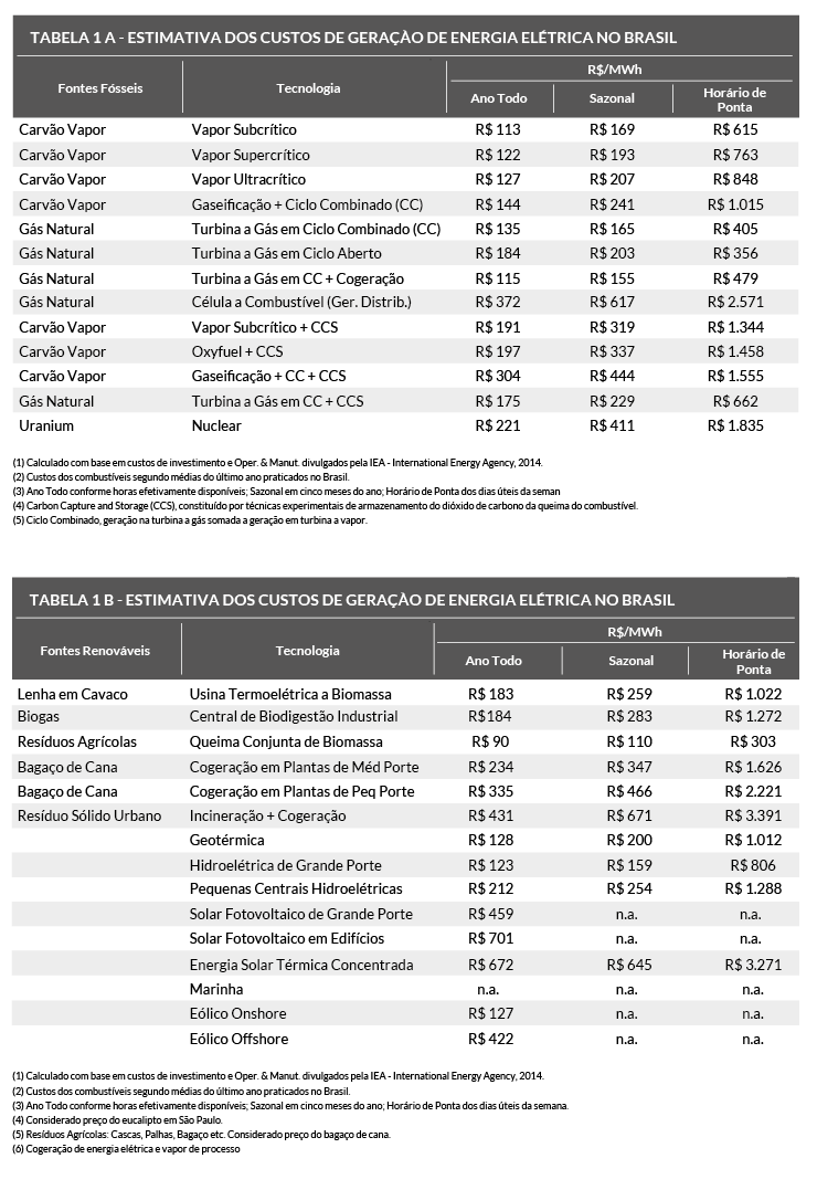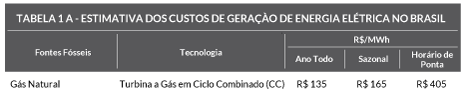 O custo da eletricidade de uma termoelétrica depende de três fatores: de quanto custou para ser construída, da sua operação e manutenção e, finalmente, do custo do combustível. Os dois últimos fatores dependem fortemente de quantas horas no ano ela funciona. A tabela 1 mostra os custos estimados para as diferentes fontes de geração elétrica em três regimes de operação. Nela se pode ver que para uma geração continua como tem ocorrido, o custo é cerca de R$ 135 /MWh.