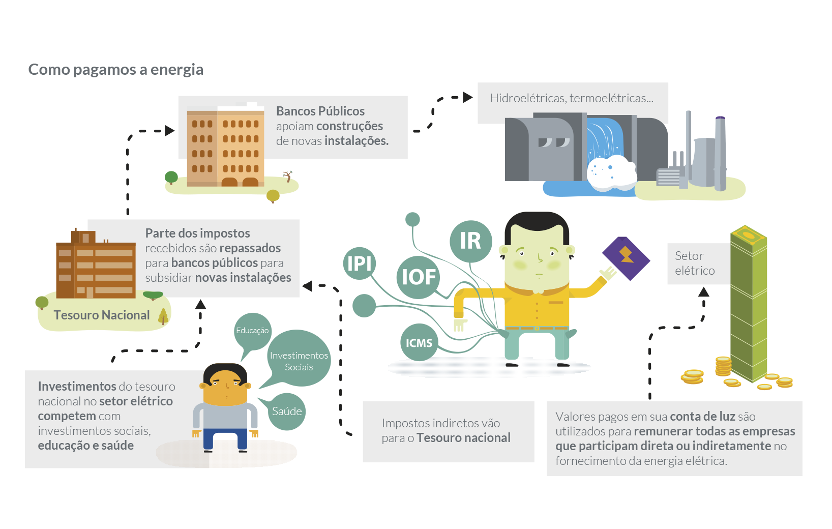 O custo da energia elétrica tem, portanto, pelo menos dois componentes. Um que é pago diretamente pelo bolso do consumo de cada indivíduo ou empresa, por meio da conta de eletricidade. Outro que é pago indiretamente - pelo bolso de contribuinte de cada indíviduo ou empresa - a partir de impostos e contribuições que subsidiam investimentos que o capital privado não bancaria, e que ainda acabam competindo por recursos com os investimentos sociais, em áreas como saúde, educação, segurança, meio ambiente etc.
