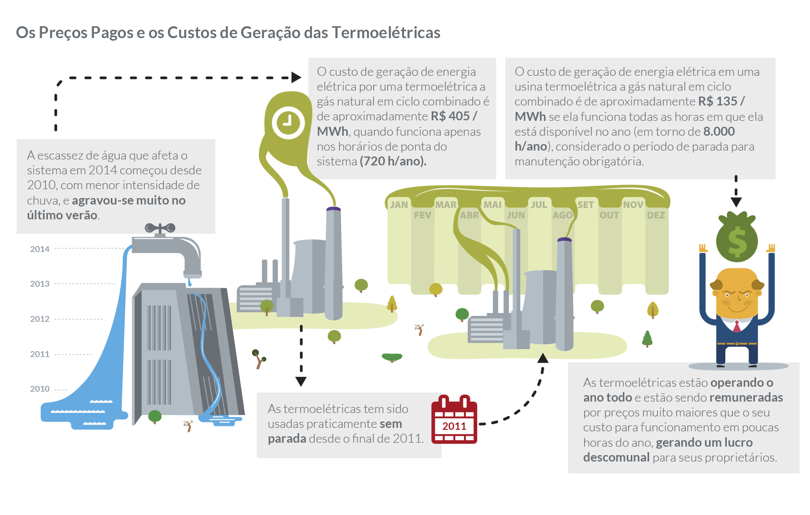 O custo de gerar energia elétrica em uma termoelétrica depende da continuidade de sua utilização, ou seja de quantas horas do dia, do mês ou do ano ela funciona. Se a termoelétrica funcionar 24 horas por dia por dez meses do ano, por exemplo, o custo do quilowatt-hora produzido é muito inferior ao do quilowatt-hora produzido pela mesma termoelétrica quando funcionar apenas um mês no ano. Mesmo assim, as termoelétricas tem sido remuneradas por preços muito acima do seu custo. Isso implica um lucro descomunal para seus donos.