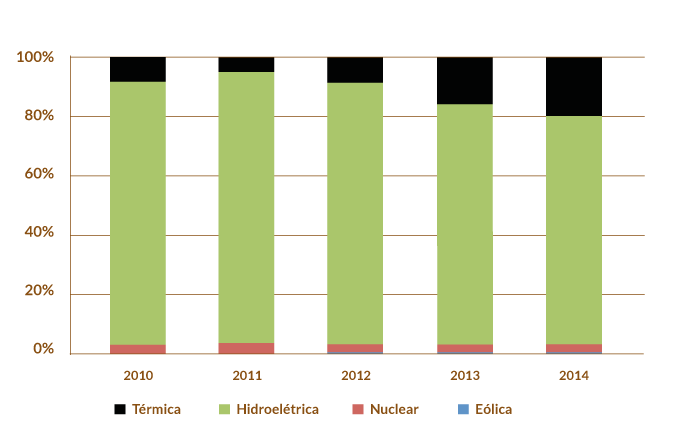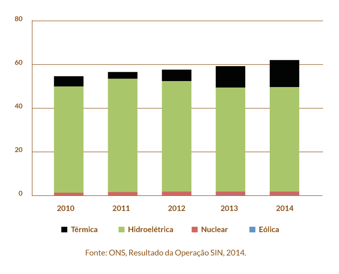 É possível ver que entre 2010 e 2012 há um aumento da geração por hidroelétricas em 2011. Isso mostra que as autoridades que gerem o SIN acreditavam que as chuvas ao final de 2010 e início de 2011 voltariam aos níveis anteriores. Infelizmente não foi o que se verificou mais tarde naquele mesmo ano, quando as térmicas passaram a funcionar praticamente sem interrupção, a menos das paradas obrigatórias para manutenção.