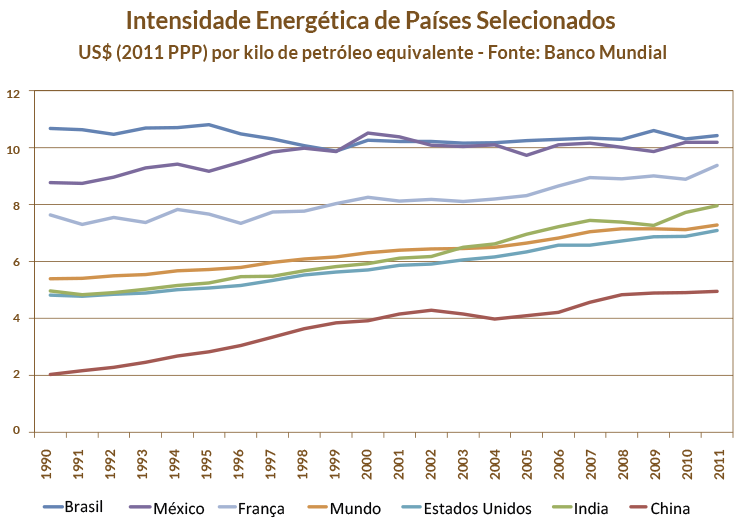 Trata-se da competitividade da economia brasileira como um todo frente ao cenário internacional. O gráfico mostra a intensidade energética - ou seja, a quantidade de produto interno bruto (PIB) gerada por cada unidade de energia utilizada - de alguns países selecionados: chama a atenção o fato de que o recente desempenho do Brasil, em vez de acompanhar a tendência de melhora dos concorrentes, tem apontado um recuo. Isso ocorre apesar do recente crescimento relativo do setor de serviços, que consome menos energia para gerar valor adicionado à economia.