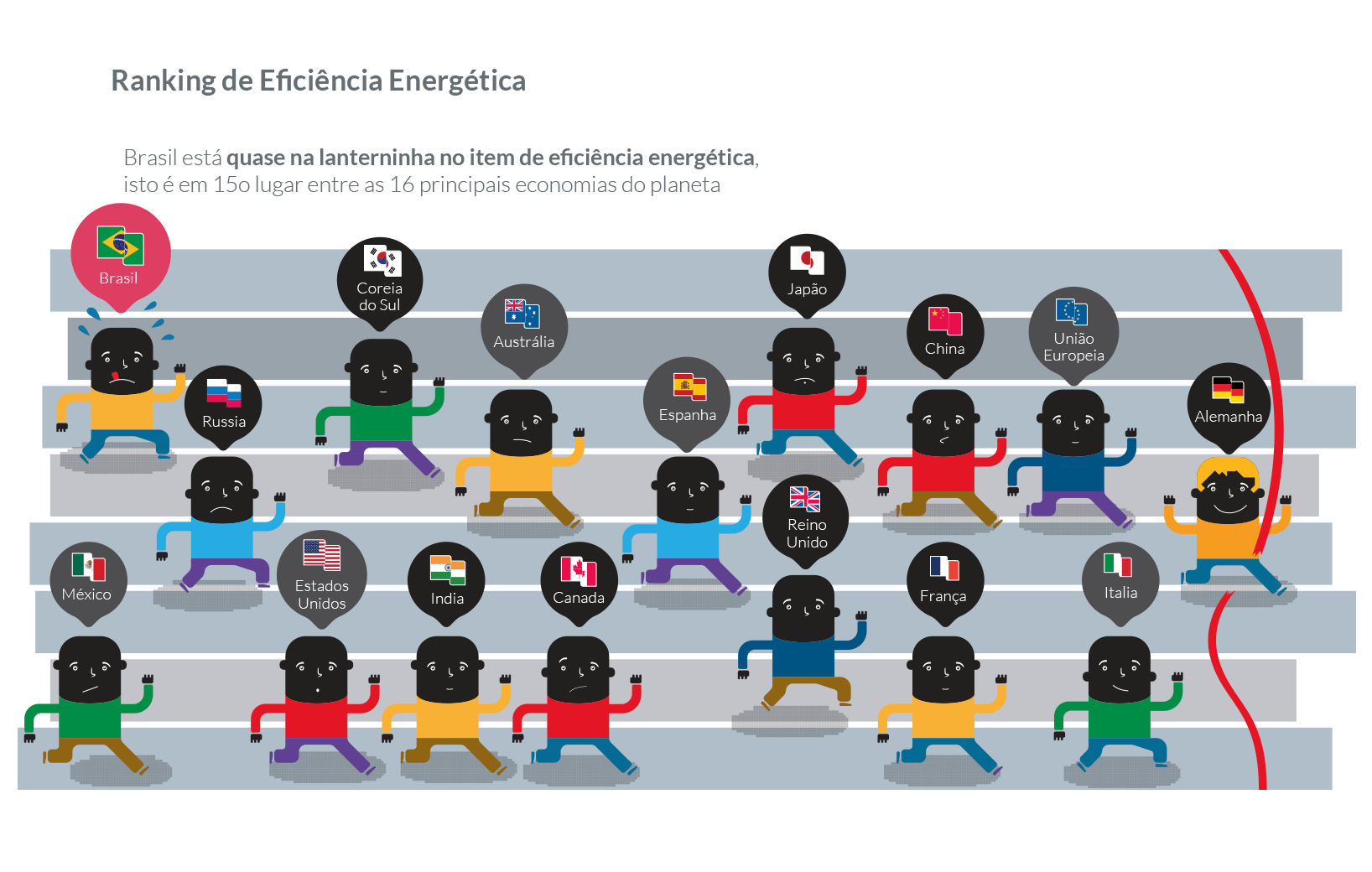 O Brasil está quase na lanterninha no item de eficiência energética, isto é em 15o lugar entre as 16 principais economias do planeta: distante não apenas dos países mais desenvolvidos, mas o que chama mais a atenção também de seus concorrentes diretos entre os BRICS, como China, Índia e Rússia. Há, portanto, um dever de casa essencial não apenas em termos de política energética, mas de viabilização estratégica da competitividade de nossa economia.