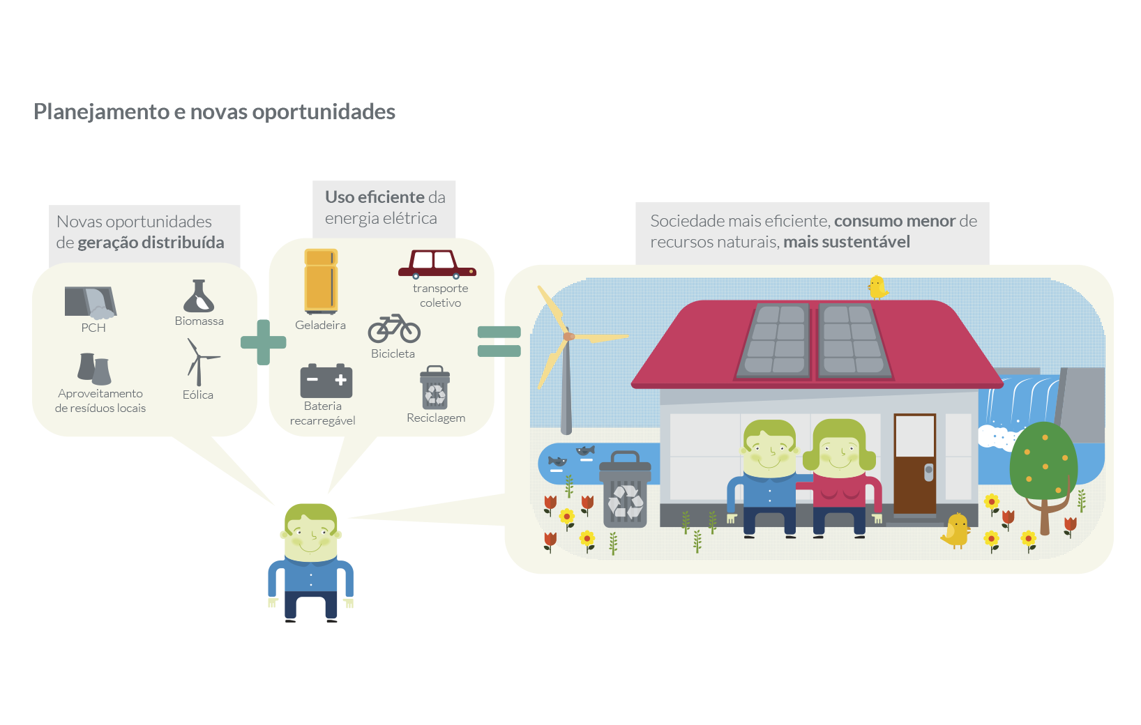 As novas oportunidades de geração distribuída mostradas anteriormente, ao lado dos potenciais usos mais eficientes da energia elétrica em todos os setores de consumo, mostram que o planejamento deve incorporar a demanda de energia, procurando inclusive as oportunidades para investir na não-geração, de forma a tornar a sociedade mais eficiente, consumir menos recursos naturais e ser assim mais sustentável. Esse é o caminho que está aberto e que será descrito em detalhe a seguir.