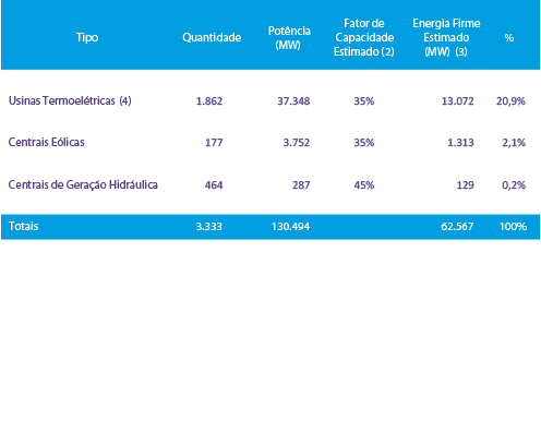 O quadro resume o parque de geração de energia elétrica existente no Brasil, conforme os dados da Agência Nacional de Energia Elétrica (ANEEL), vinculada ao Ministério de Minas e Energia, que fiscaliza, autoriza, permite, outorga ou concede a operação dessas instalações.